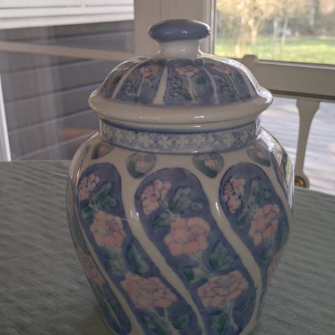Keramik, Krukke, Retro, Rigtig lækker ældre keramik krukke fra det gamle DDR. En fin råhvid glasur med håndmalet blåt retro mønster. Krukken måler 10 cm.i højden og 12,5 cm.i diameter i bunden. Den er i perfekt stand og vil pynte i de fleste hjem.. Måske med en lille blomst i.