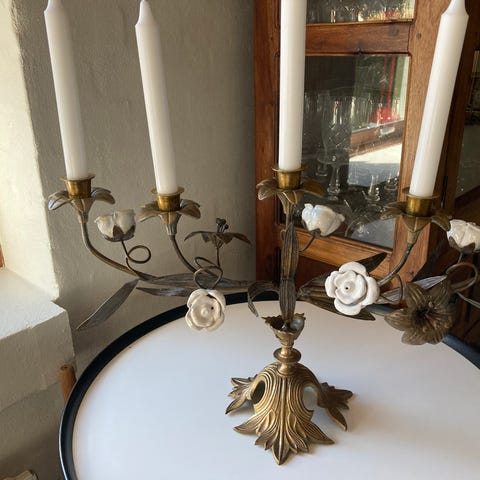 Kirkestage - lysestage, Antik kirkestage i forgyldt træ. Ca 100 år gammel smuk lysestage. 41 cm. høj. Små afslag på bagsiden. Købt i Italien hos antikvitetshandel i Rom