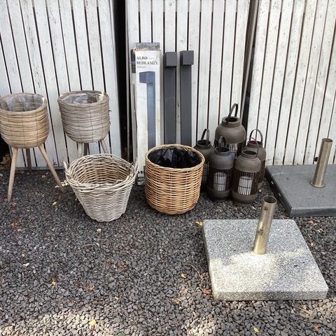 Diverse haveting - bl.a. kurve, urtepotter, krukker, Grønland hvide glaserede urtepotter, mælkejunge mm