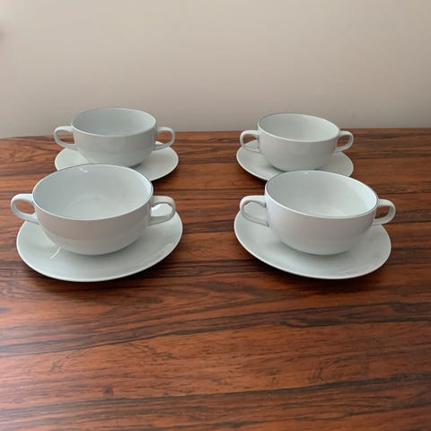 Fajance, Bouillonkop, Blåkant - Aluminia, 6 sæt bouillonkop med underkop (nr. 3081) i serien Blåkant designet af Grethe Meyer for Aluminia.