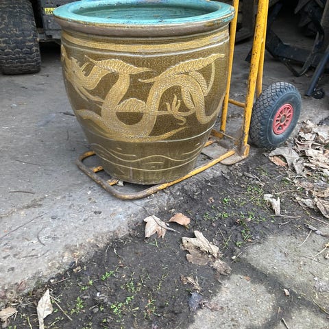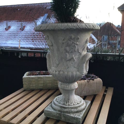 Havekrukke, Beton, Stor betonkrukke i 2 dele.( meget tung). 80 cm høj, diameter 67cm. Dekoreret med putto .