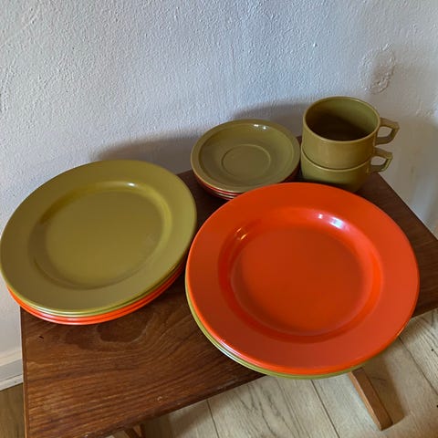Plastik, børneservice, melamin/plast, 9 div. tallerkner - 6 krus - 3 små skåle- Brugt men ok
