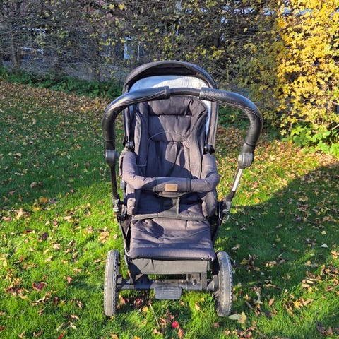 Klapvogn, Emmaljunga, Klapvogn med plads til barn nr. 2 foran styret (det kan pilles af klapvognen, men den kan også bruges som sæbekassebil, så stærk er den nu. KUN 475,- Kan Evt. Leveres i nærområdet. Med alle tænkelige finesser, vendbart styr osv.