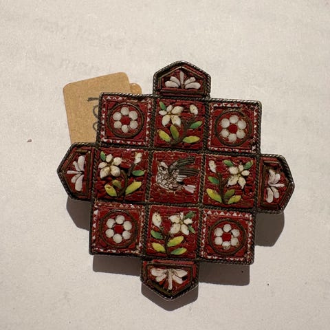 Over 120 år gammel broche i Micro-mosaik fra Italien. C- låsen bagpå betyder, at brochen hører til de aller tidligste af sin art og blev brugt før vi tog hul på 1900-tallet.