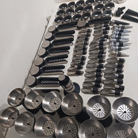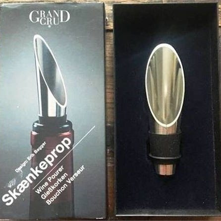 Vinprop og skænkeprop, Rosendahl Grand Cru, Design Erik Bagger 1993. Fremstillet af massivt rustfrit stål med fødevaregodkendt og alkoholresistent sort gummi. Pris pr del 100kr eller begge for 150kr. Jeg har flere annoncer med vinpropper. Søg evt på: ksø vin