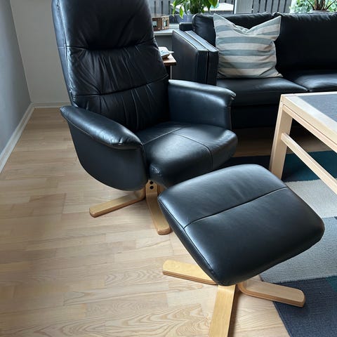 Lænestol med fodskammel i skind, Sort lænestol på drejeben. Dejlig til middagsluren.
