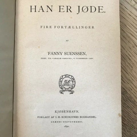 Fire fortællinger, Fanny Suenssen, genre: noveller, Originaludgave fra 1892 i halvlæderbind med guldtryk på ryg. 299 sider. De fire fortællinger er: 'Han er Jøde', En Pebersvend', 'Ellen' og 'Jeg kunde ikke andet'.