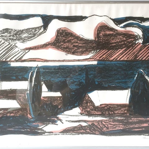 Litografi, Evan Jensen, motiv: Landskab i modernistisk udtryk og friske farver