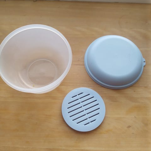 I låget medfølger et sæt salatbestik, samt et lille bæger der er 8 cm i diameter og 5 cm højt, hvor i man kan komme dressing eller tilbehør / pynt til salaten.