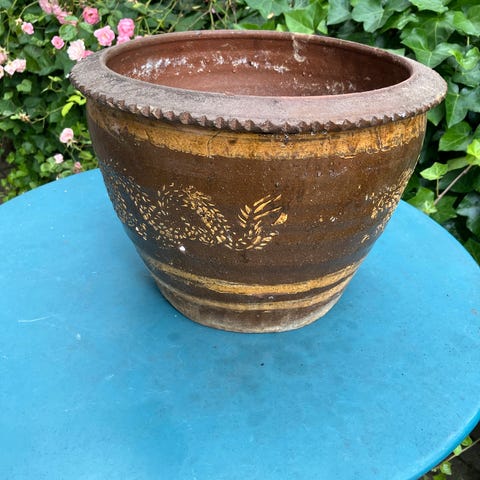 ET PAR SMÅ, GAMLE KERAMIK-POTTER, DECO MED BOGSTAVER I DET VÅDE LER, NAVNET: "FLEUR", PÅSAT IND I OVAL, I DET VÅDE LER.