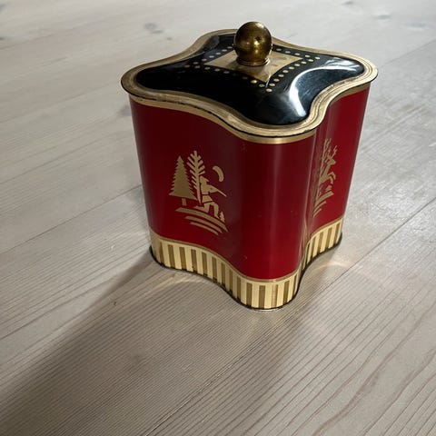 dåse, æske med låg. Metal, brun, dekoreret med blomster og med hulmønster foroven. Højde 12cm, diam 8cm.