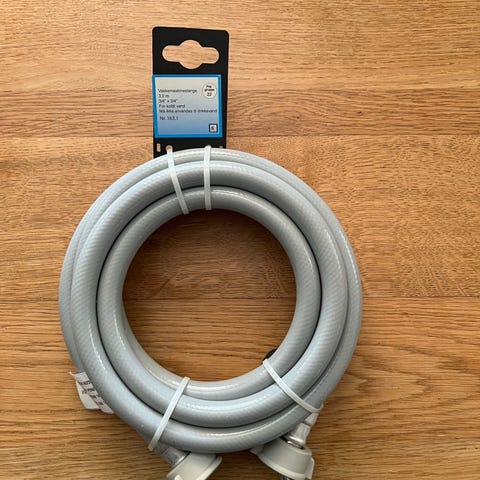 En grå tilslutningsslange på samlet 150 cm inklusiv pakninger., samt med ophæng. Den ene pakning er på 90 grader, så det bliver lettere at få opvaskemaskinen eller vaskemaskinen op af væggen.