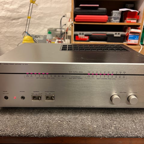 Effektforstærker, Luxman, M12 med 2x75 watt. Dual mono konstruktion med 2 individuelle ringkerner. Der er justeret tomgangsstrøm og kontrolleret offset.