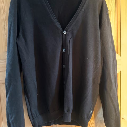 Cardigan, Hugo Boss, str. XL, Sort, Ubrugt, Sort Hugo Boss cardigan / trøje med mange smarte detaljer af imiteret skind. Str XL. Har aldrig været brugt.