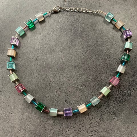 Flot, flerfarvet geocube-halskæde (Coer de lion) designet og produceret i Tyskland. Kæden er ca. 45,5 cm i fuld længde og i perfekt stand; der er ingen synlige brugsspor. Den ligger i original æske og har nr. K3988. Sender gerne.