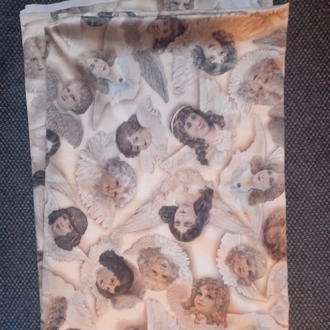 Stof, Engle til at sy på evt nattøj spise, som her vist. Hver stk med engel måler 39x26 og koster 20kr stk. Posen med engel på tager jeg kun 35 kr