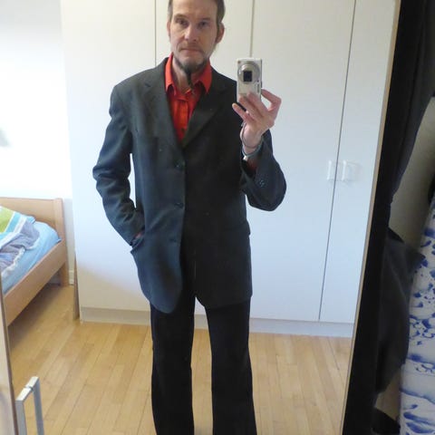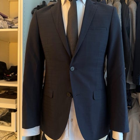 Jeg har siden lagt mig en del ud, så jeg kan desværre ikke længere passe jakkesættet, der er i fin stand.