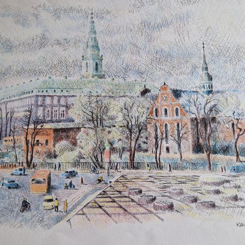 Litografi, Karl Johan Larsen, motiv: Christiansborg slot