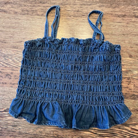 Top, Crop top med "chiffon" overdel, H&M, str. 152, Sort crop top med chiffon-ligende overdel. Knap i nakken (ekstra knap medfølger).