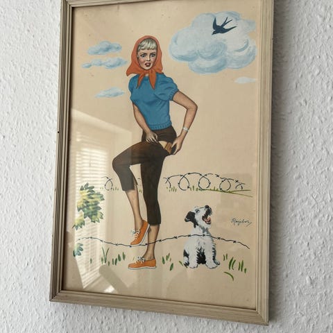 Pige med bukser, måler 34 x 16,5 cm. Rammen mangler glas/plast.