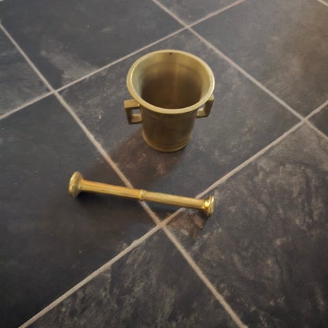 Antik morter, Messing, 150 år gl., Pæn og velholdt morter inklusive støder. Højde: 10,5 cm. Diameter: 12 cm.