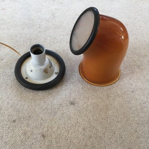 Astronaut er tegnet af Michael Bang for Holmegaard tilbage i 1960érne. Vi har glaslampen i orange. Lampen kan både anvendes som bordlampe eller hænges på væggen.