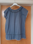 Bluse, Culture, str. 42, Gråblå, Bomuld, bluse med perlepynt øverst på blusen øverst foran og i nakken. Regulerbar bindebånd I halsudskæringen. Lys bånd med små kugler rundt i ærmekanterne og forneden. Smal blonde 10 cm. Fra nederste kant. Længde 65 cm. Brystmål op til 104 cm.