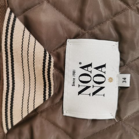 Vest, Noa Noa, str. 42, Næsten som ny, XL. Festlig, kort vest i brun bundfarve, med gennemsigtige perler rundt langs alle borter. Lukkes ikke. Ca. 39 cm. Lang. 63% bomuld; 37% viskose