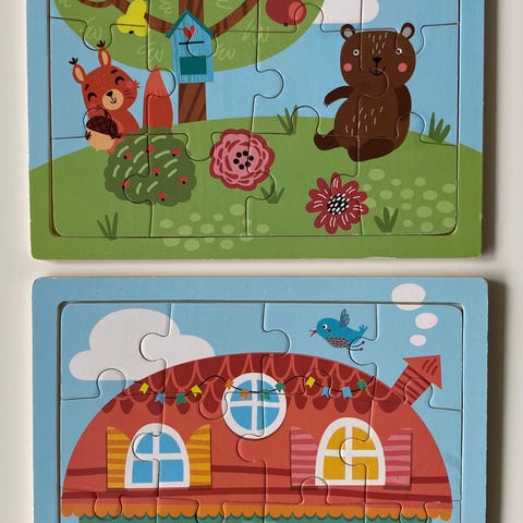 9 forskellige , Træpuslespil, puslespil, Kun fire klodser per figur. Af ældre dato men stadig fine. Se billeder for mål.