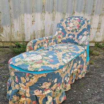 Chaiselong, Ukendt, ca. år 1900, Antik chaiselong i lysegult stof med røde nister. Ydre mål: L: 170 cm, dybde: 75 cm og højde: 88 cm. Sædehøjde: 45 cm, sædedybde: 55 cm, sæde længde: 145. Ombetrukket med bløde (ældre) fjedre. Købt i Belgien. Den er fra ca. 1900.