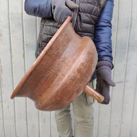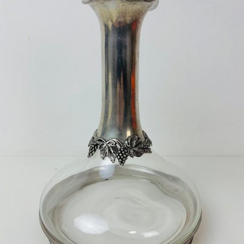 Funktionel og dekorativ vin dekanterings tragt med si. Alder cirka fra år 1900. Upudset og bør ikke pudses da patinaen giver den det sidste.