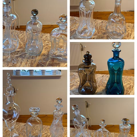 4 flotte enkle glaskarafler. De 2 er fra Holmegaard og de 2 andre kendes ikke mærke på, men de er stort ses ens alle 4. Den ene har en fin intakt guldkant foroven.