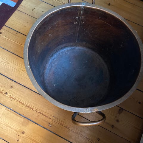 Gruekeddel, Flot gammel gruekeddel i messing med hank.