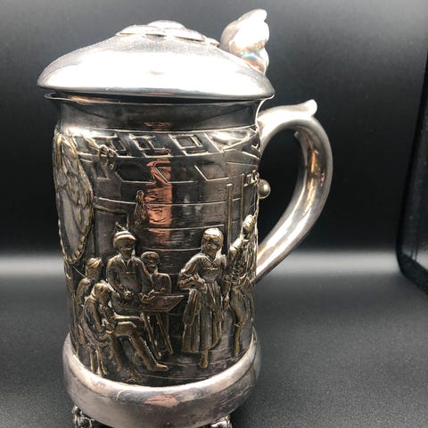 To vintage ølkrus af krystal med håndskårede motiver