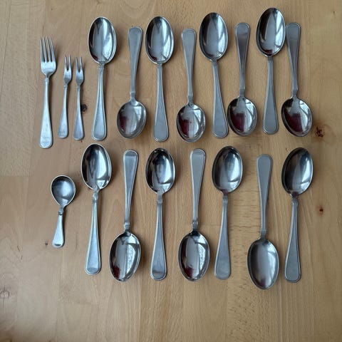 Diverse bestik designet af Aage Helbig Hansen bla Dana 58 og Jubilee, ialt 18 dele for DFA. Almindelig brugsspor. Teskeen har indgraveret et M på forsiden af skaftet.