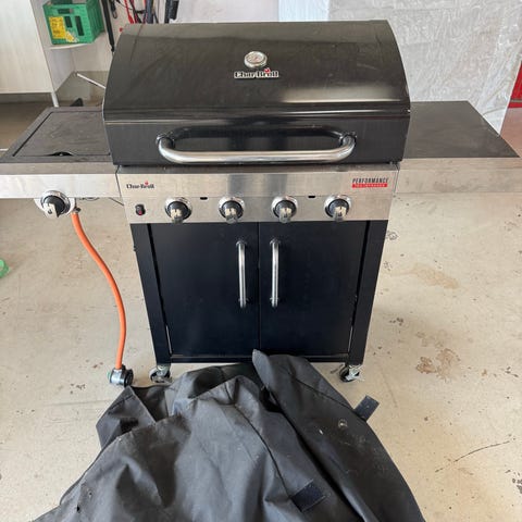 Gasgrill, Charbroil, 4 dele - Ritisserie, spydsæt, pizzasten og rotisseriekurv/grøntsagskurv. Helt nye, ikke taget i brug (bortset fra pizzastenen, som har været brugt én gang) - sælges samlet.