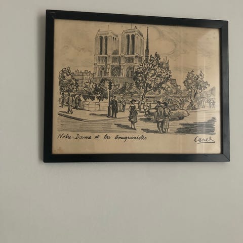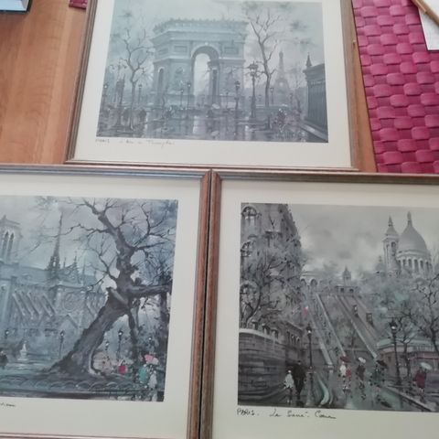 Billeder, 2 charmerende gamle tryk af turistattraktioner i Paris fra ca 50erne. Mål: Sacre Coeur46 ,5 cm X 21 cm med ramme. Mål: Notre Dame: 46X 20 cm med ramme. Pris pr stk. 100,- Samlet pris: 150,-