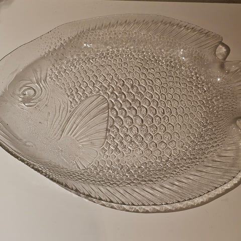 Stort gammelt fiskefad, Svensk, Charmerende rustikt gammelt fiskefad i glas. Den er i fin stand. Vejer 1,7kg.