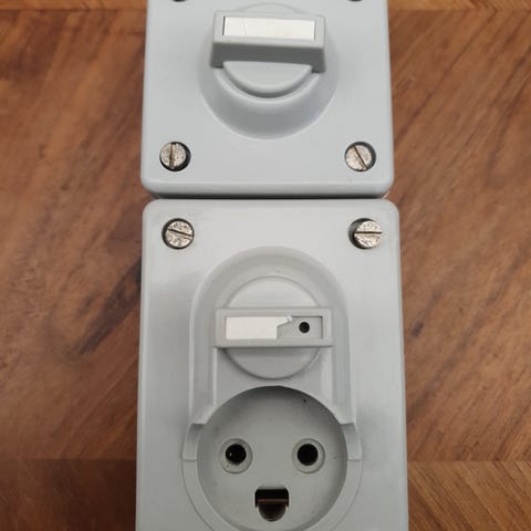 Vi har 1 stk. retro grå NES udendørs stikkontakt med drejeafbryder uden jord