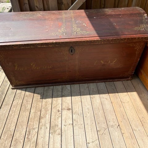Denne dragkiste er meget unik og sjælden i det låget er i et stykke og derfor så bredt at den vurderes til at have været lavet før 1700 tals krigene idet alle større træer blev fældet og anvendt til at producere krigsskibe. Senere er den blevet lavet om til en brudekiste i 1794. Som også er dateret på kisten.