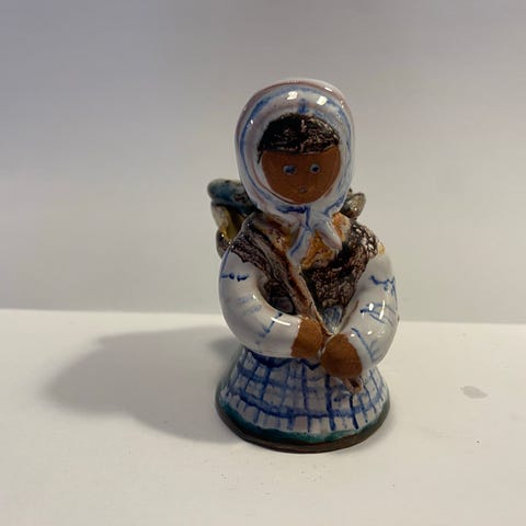 Keramik, Fiskerkone, Flot figur af Bornholmsk fiskerkone i en unik farvekombination. Figuren findes normalt i blå / hvid kombination. Fremstår i fwjlfri stand. Figuren er 14 cm høj, og 6,5 cm i diameter. Billederne er mine egne.