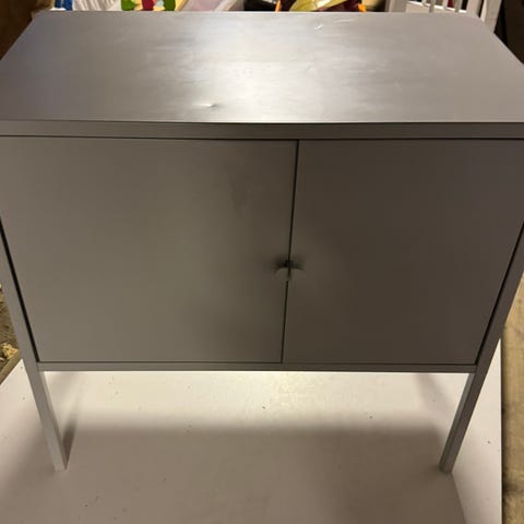 - Gråt væghængt spejlskab i metal med 2 hylder. Uden nøgle. 32x32x10,4kr. 150kr.