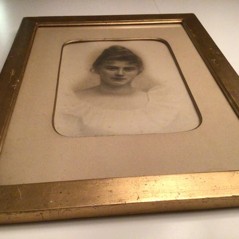 Nøgen kvinde i positur. H: 65 B: 46 cm i guldramme og glas.