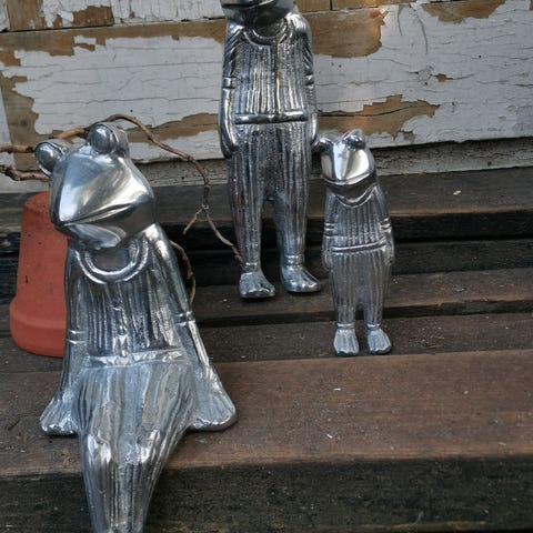 Frøer, Par frø i gips eller lign, med patina. 14,5 cm høje og 14 x 9 cm