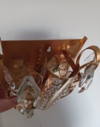 Væglampe, Vintage, Væglampe : Smuk vintage guldmetal væglampe med både store prismer og små prismer - giver det smukkeste lys - måler 18 x 18 cm - Kan sendes for 50 kr