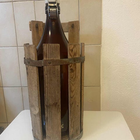 Gammel stor grøn ølflaske i træbeholder, Viborg Øl