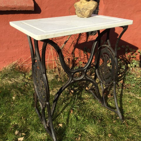 Symaskine bord, Gammelt, Flot symaskine bord. Med en spicelt lavet marmorplade til det. Gammelt. Flot stand. Ca 85 cm lang Ca 45 bredt. Sælges samlet. Fast pris. Kun seriøse henvender.