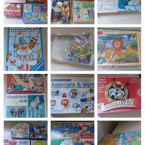 Blandet legetøj, Spil, Blandet, Sælger lidt ud af spil i forskellige arter. Huskespil, vendespil, puslespil, lotteri, tal læring.