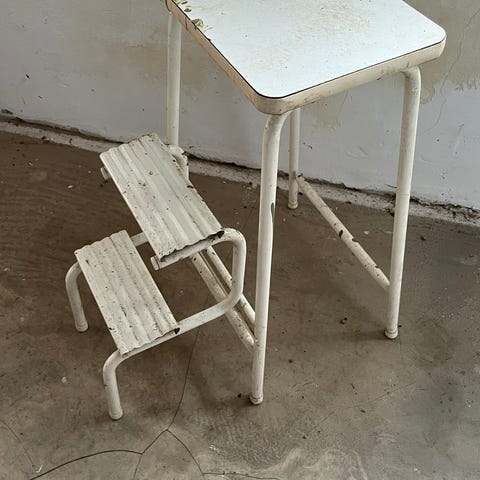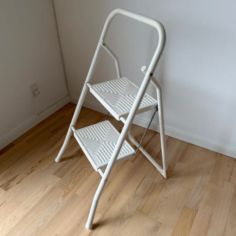 Billede 1: Ældre hvid køkken-trappestige med metaltrin. Højde: 61cm. 400kr.