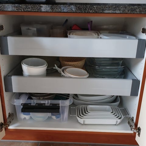 Billede 1: Hvid skuffe uden front, inklusiv skinner. Ny. Bredde: 60cm. Dybde: 37cm. Skuffefronten skal min. være 15cm høj. Pr./sæt: 100kr. (rest 2)